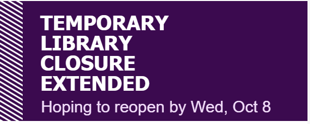 Our crews have run into some unexpected delays over the weekend. Unfortunately, that means we need a couple more days than originally anticipated to prepare the library space for public access again. Our new projected reopening date to the public is Wed, Oct 8 at 9am.