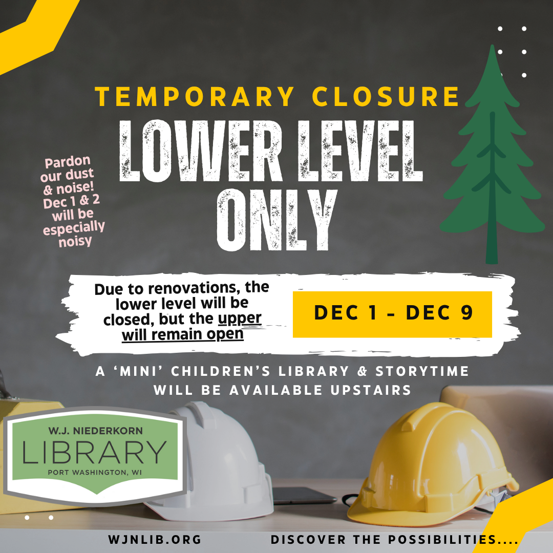 - Due to demolition and retiling of the staircase and lower-level hallway, our lower level, including the Children’s Library, will be closed from Mon, Dec 1 – Tues, Dec 9. Our upper level will remain open.
